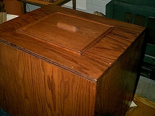 I placed a layer of sheet vinyl between the inner lid and the insulation to assure a smooth surface. The lid is a box with an oak drawer pull, filled with rigid foam, and epoxied with fiberglass mat. I used mahogany stain to match the laminate of the bulkheads and galley. Below is the finished box minus the trim which I will install in the Spring when I commission the boat.