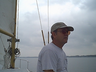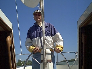 Here I am at the wheel. I've now sailed for more than twenty years. I was hooked after taking a cruising course at the Annapolis Sailing School. Over the years I've owned a number of old boats. My first was an Ensenada 20, moved up to a Hunter 25, then a Ranger 30, and now a Westerly Berwick. Each held its own adventure and served as proof positive that the water rat in Wind in the Willows was correct. "There's nothing quite like messing around in boats!"
