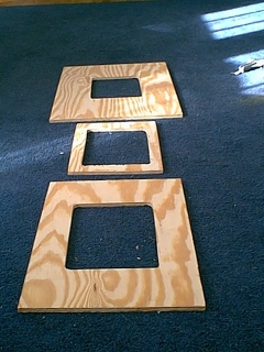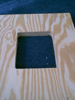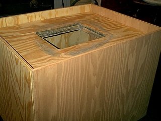 I created a sandwich to allow me to get a fully insulated seal around the container and still be able to have several inches of unbroken insulation above. Note below that the inside corners have been faired (not shown: then taped and epoxied). You may be able to see how the nested plywood permits the addition of a layer of foam between the smaller section to which the container is attached and the larger top piece which serves as the inner lid.
