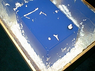 Here the blue container has been screwed to the sandwiched GRP (I'm turning into my Scottish self again!) I foamed between two plywood layers before adding rigid styrofoam. Note the foil liner that I added as a reflective barrier. I laid it over the wet epoxy.