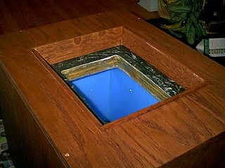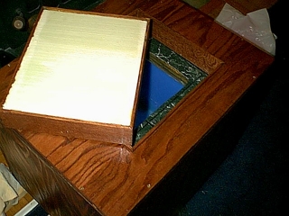 I placed a layer of sheet vinyl between the inner lid and the insulation to assure a smooth surface. The lid is a box with an oak drawer pull, filled with rigid foam, and epoxied with fiberglass mat. I used mahogany stain to match the laminate of the bulkheads and galley. Below is the finished box minus the trim which I will install in the Spring when I commission the boat.